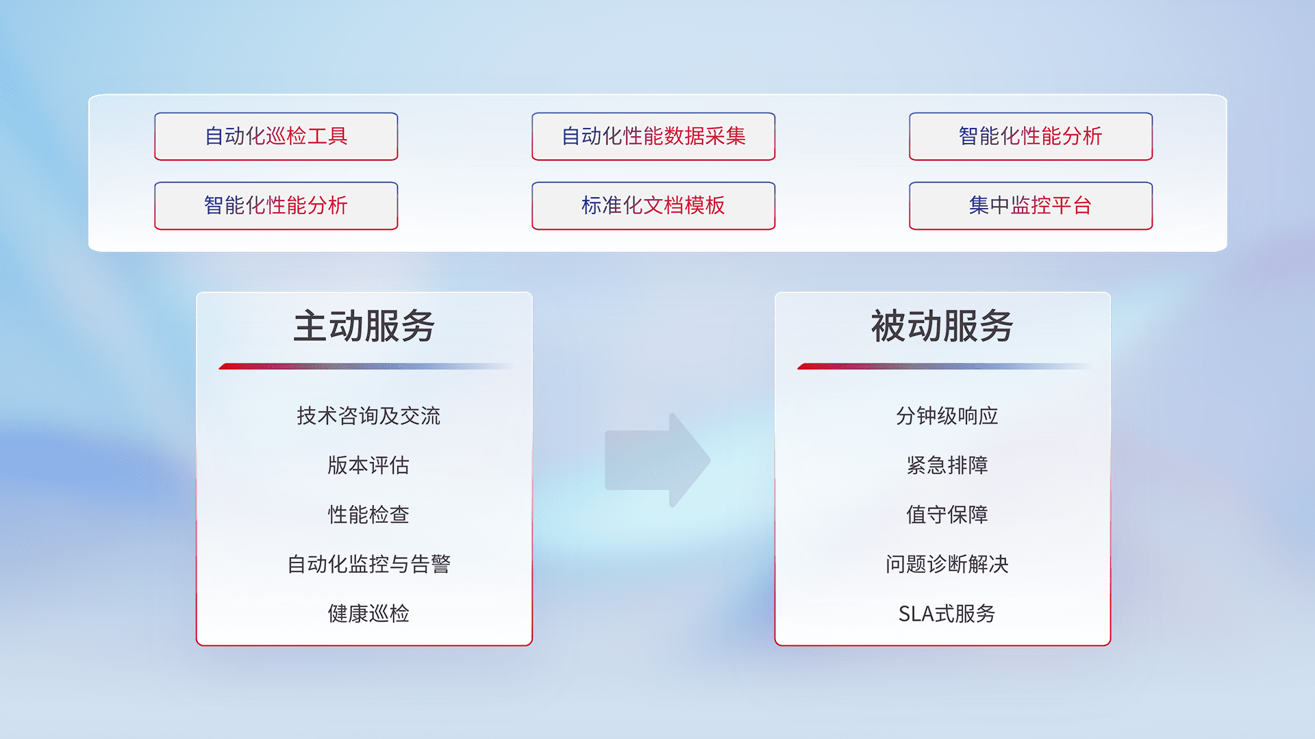 智能化工具和标准化文档,,保障服务质量,,,提供主动服务(包含技术咨询、、、、版本评估、、、、性能检查、、、自动化监控与告警、、、健康巡检)和被动服务包含(分钟级响应、、、紧急排障、、、、值守保障、、问题诊断解决、、SLA服务)。。